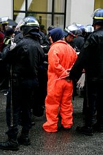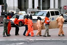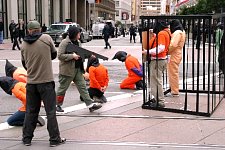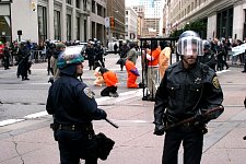 The shut down started around 8:00 am when about 25 protesters, some dressed as Guantanamo Bay prisoners and guards, others carrying signs accusing Dianne Feinstein, who's office is nearby, of complicity with the war, stopped while crossing market street and refused to move. The police quickly cordoned of the entire intersection and connecting streets.