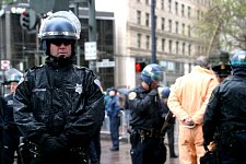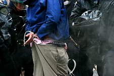 All of the protesters allowed themselves to be peacefully arrested, while a crowd of around 250 chanted and played music as the rain turned into a downpour. The arrests were complete and the intersection was cleared by 9:00 am.