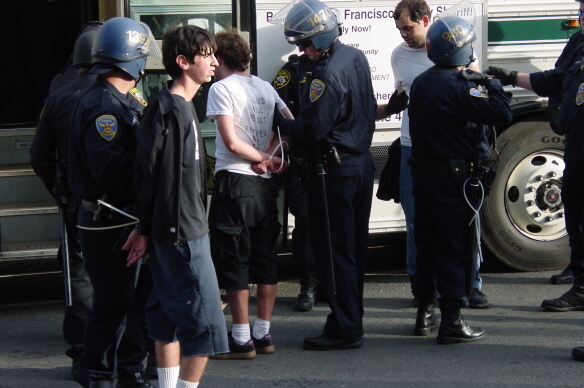 Without apparent provocation San Francisco police attacked protesters and pedestrians standing on the sidewalk of Market street near 5th on March 20th at approximately 3:30 pm.