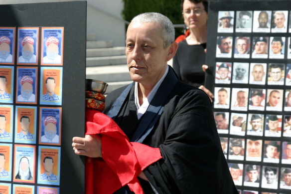 Plaza with a prayer by Buddhist monks. The somber procession,